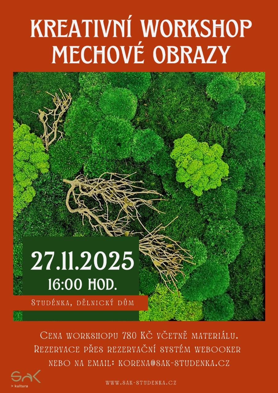 Koupit vstupenkuZveme vás na jedinečný worshop tvorby mechových obrazů, který se uskuteční ve čtvtek 27. listopadu od 16:00 hod. v klubovně Dělnického domu.