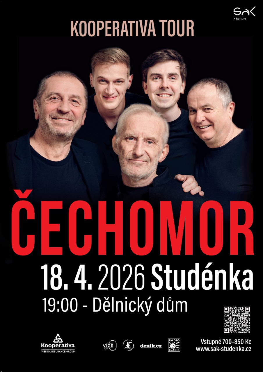 Koncert Čechomor 3. prosince 2025 Právě jsme spustili předprodej na dubnový koncert kapely Čechomor. Vstupenky zakoupíte on-line nebo na prodejních místech (IC Studénka a kancelář Kultury v Dělnickém domě). Více informací o koncertu ZDE