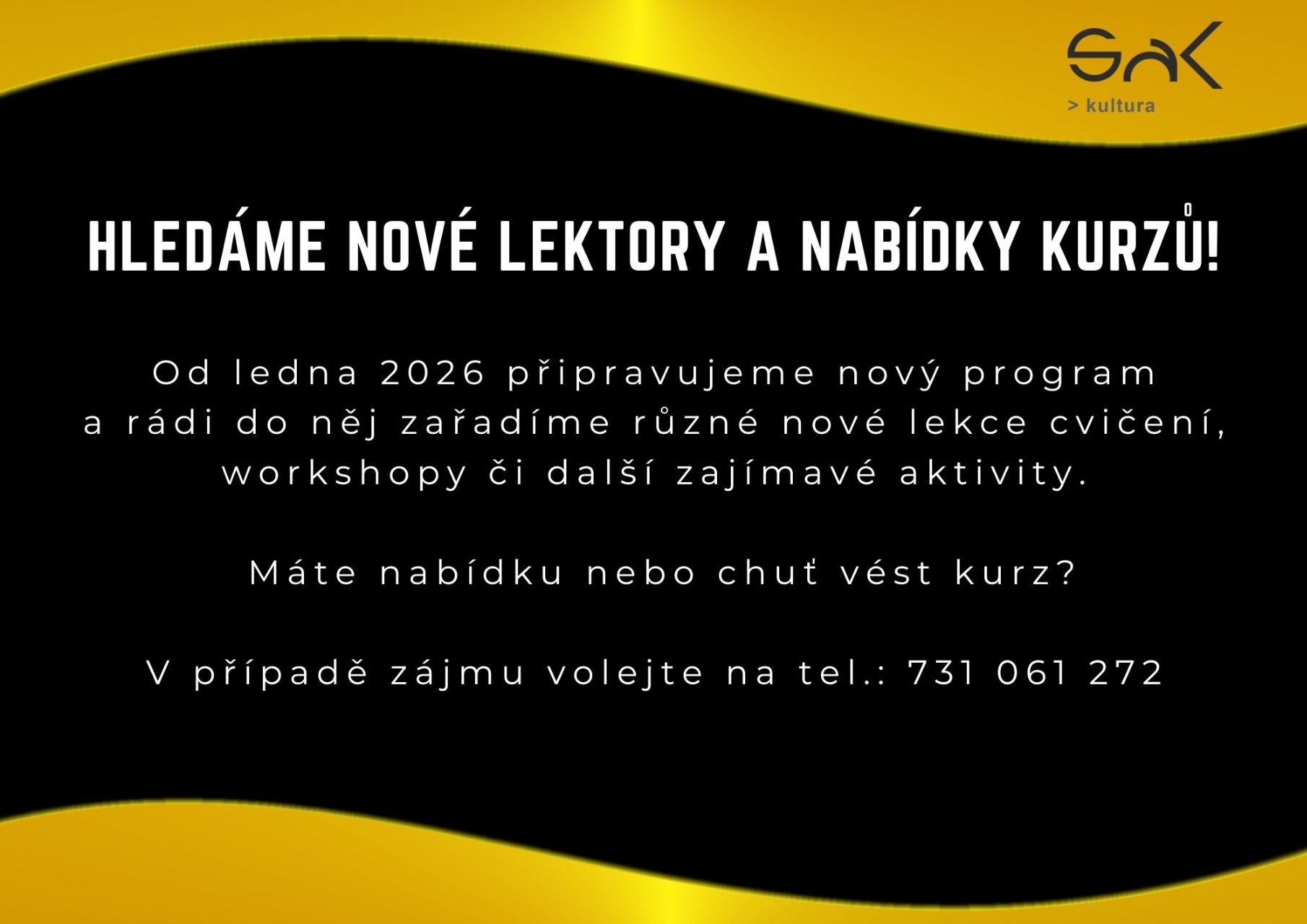 4. prosince 2025Od ledna připravujeme nový program a rádi do něj zařadíme nové lekce cvičení, workshopy či jiné zajímavé aktivity. Máte zkušenosti s vedením skupinových lekcí cvičení nebo zajímavých workshopů? Pokud ano, neváhejte nás kontaktovat.